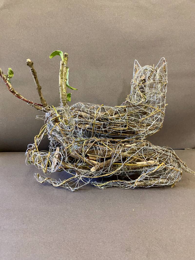 For this piece of work I focused on predator and prey and how all animals are linked and have a role in a ecosystem. This can be seen in the work by the use of a wolf and deer representing predator and prey and also the use of sticks linking the work to nature.